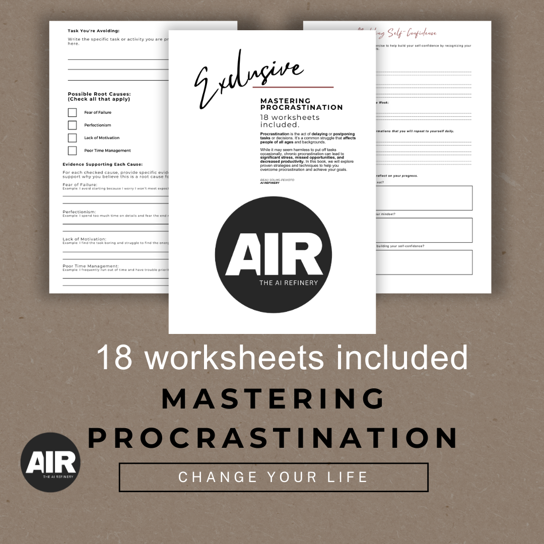- 18 Comprehensive Worksheets: Dive deep into understanding and overcoming procrastination with exercises that help you identify your patterns, set clear and achievable goals, and build lasting productive habits.