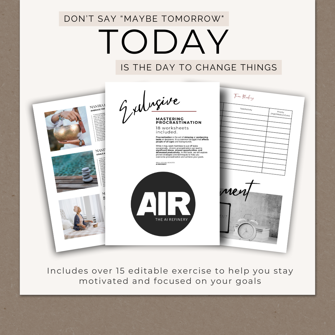 I was getting tired (and frustrated with myself) for constantly putting off important tasks and missing out on opportunities. so, I created the “Mastering Procrastination” workbook with over 15 worksheets to help you conquer procrastination and achieve your goals!